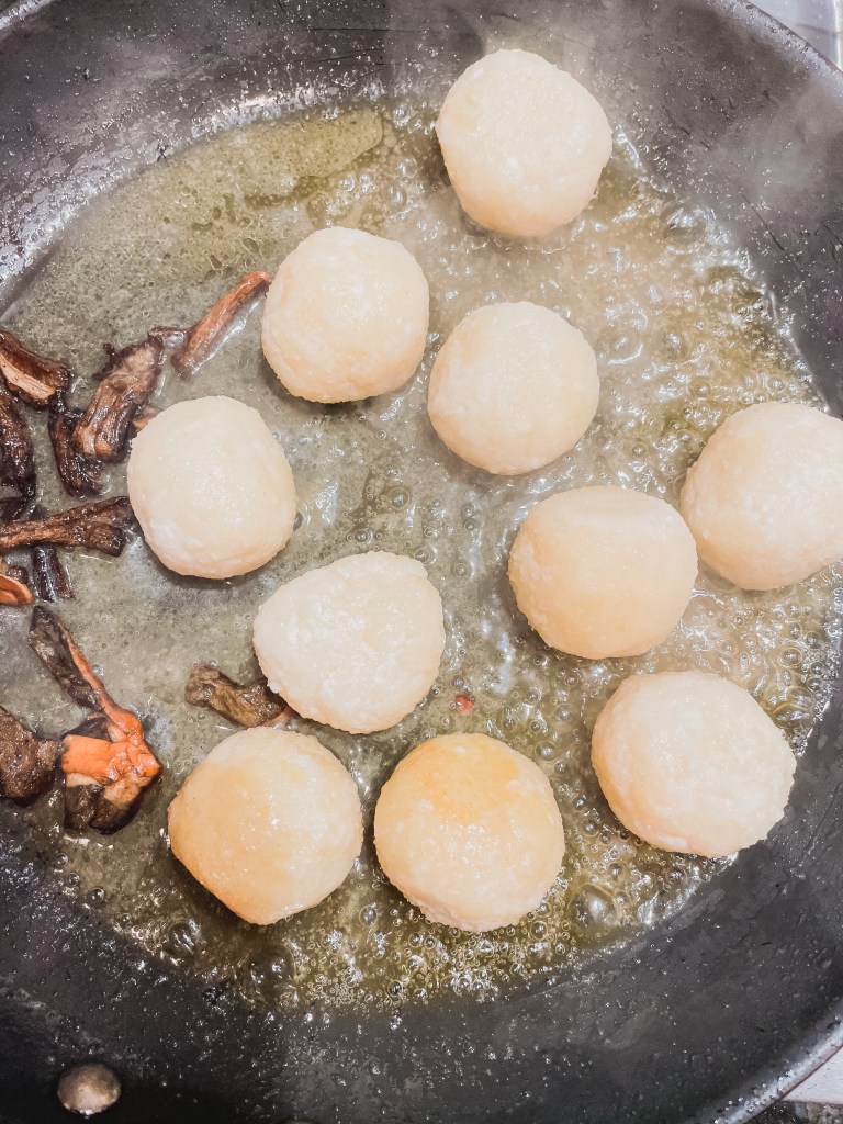 To make the sauce add the porcini mushrooms and olive oil to a hot pan and allow the mushrooms to cook down for about five minutes. While this is being done begin cooking the gnudi.