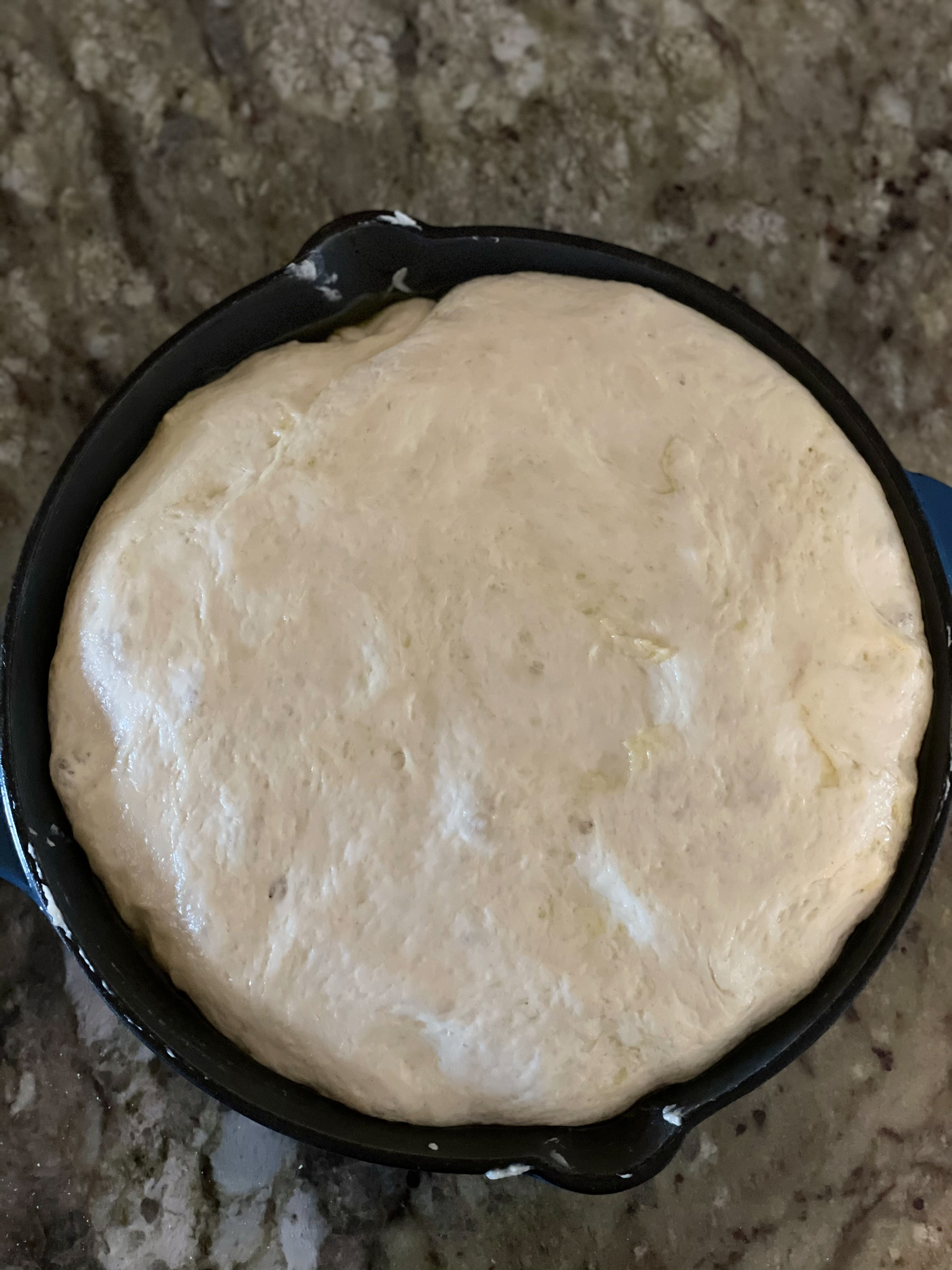 Remove your dough from the fridge and pulling it from the sides, place into your buttered pan. Allow to rest and rise, doubling in size, for two to four hours depending on your room temperature. Keep the pan near the oven to provide it with a little extra warmth as the over warms up. I found that three hours is the sweet spot.